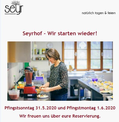 Abonnieren Sie jetzt unseren kostenlosen Newsletter und erfahren sie mehr über bevorstehende Termine, Events und alles, was sich bei uns am Seyrhof so abspielt 🙂 Hier geht es zur Newsletteranmeldung!